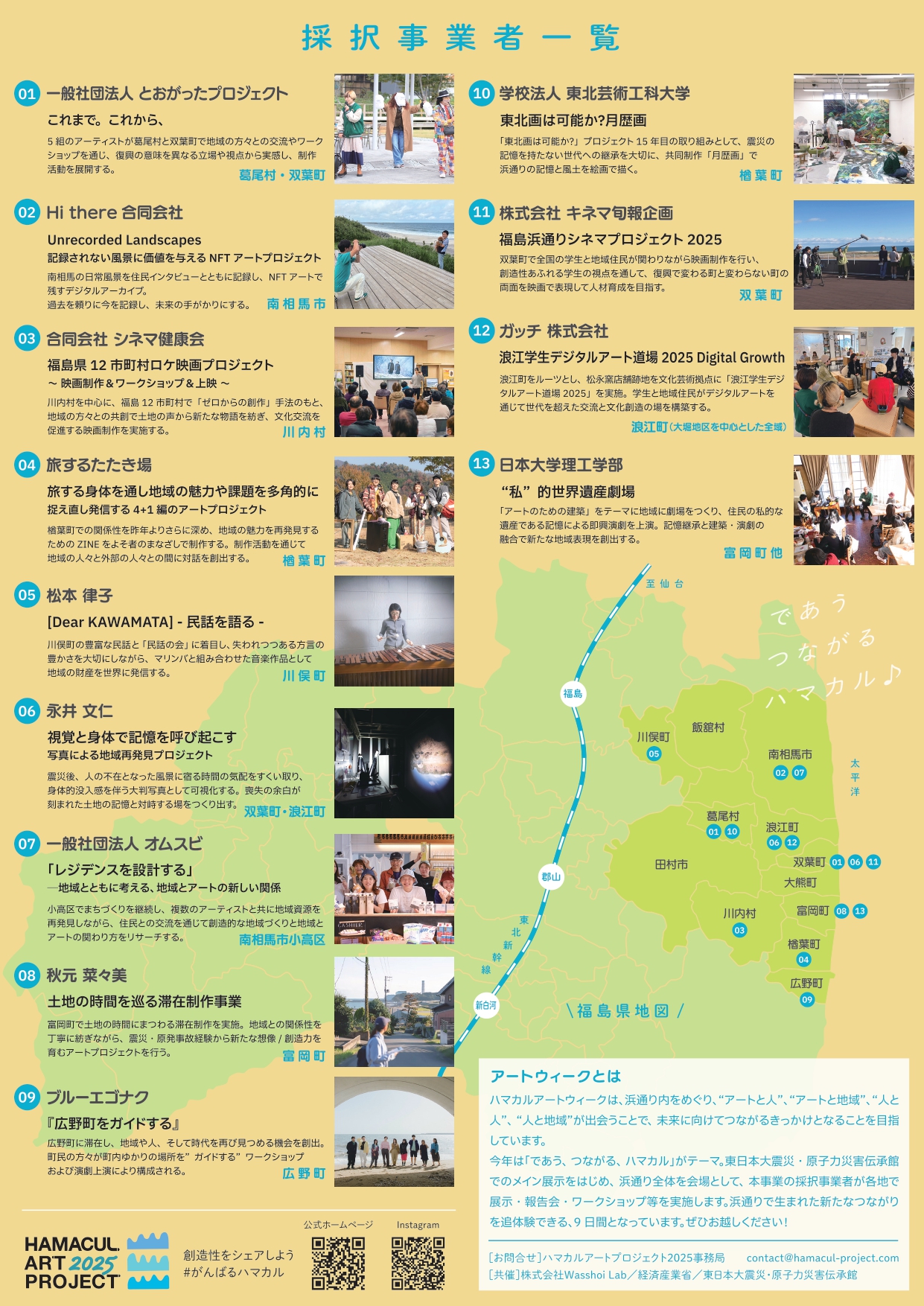 ハマカルアートウィークは、浜通り内をめぐり、"アートと人"、"アートと地域"、"人と人"、"人と地域"が出会うことで、未来に向けてつながるきっかけとなることを目指しています。今年は「であう、つながる、ハマカル」がテーマ。東日本大震災・原子力災害伝承館でのメイン展示をはじめ、浜通り全体を会場として、本事業の採択事業者が各地で展示・報告会・ワークショップ等を実施します。浜通りで生まれた新たなつながりを追体験できる、9日間となっています。